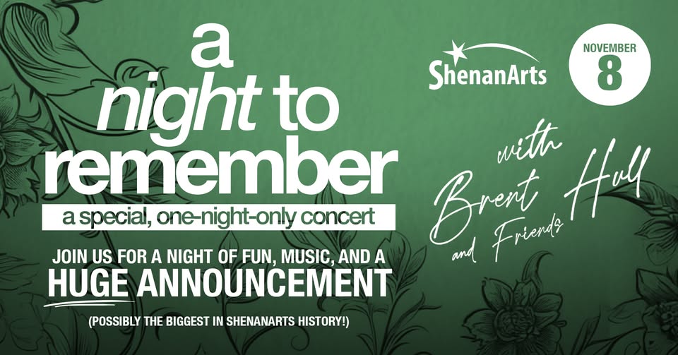 We have some HUGE news to share with you! So huge, in fact, that an announcement on social media simply won’t cut it. So we thought, “Hey, let’s make a night of it!” Join us on November 8 for A Night to Remember! A special, one-night-only concert event featuring the incomparable Brent Hull (with some surprise appearances!) Following a night of fun and some amazing music, we’ll pull the curtain back on a truly monumental surprise. Trust us, this is a moment you’ll want to witness in person! Get your tickets now and be a part of ShenanArts history! Tickets: https://shenanarts.org/a-night-to-remember/