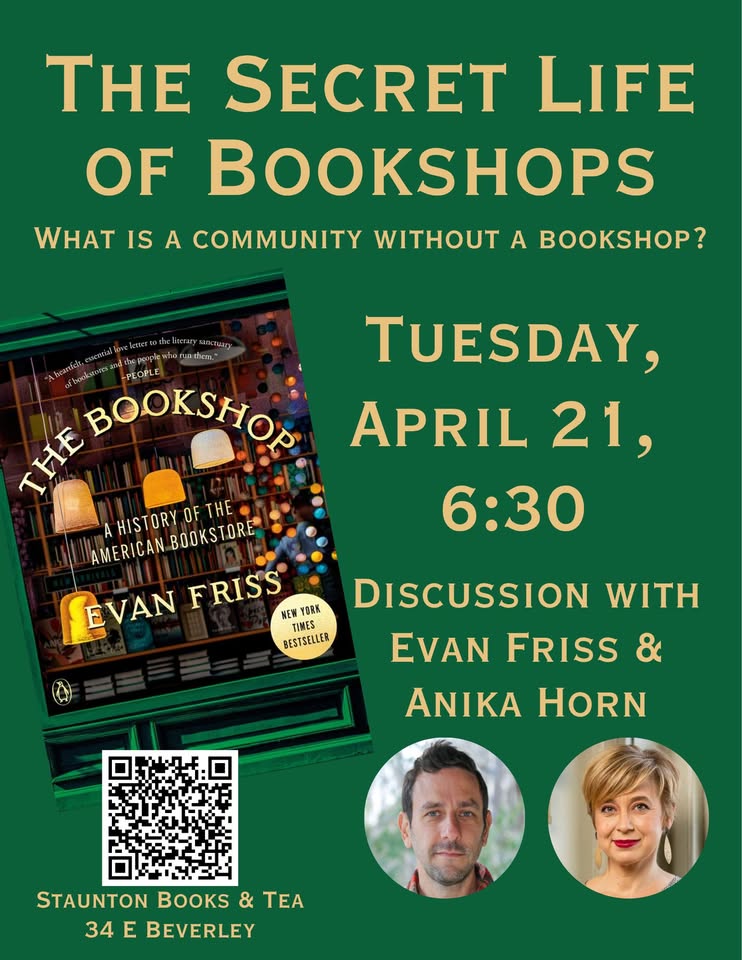 You probably think you know what a bookshop is. A place to buy books. Maybe browse. Maybe linger. But is that really all? This Indie Bookshop Day, we’re asking the question out loud — and we’ve brought two of the most thoughtful people writing about bookshops today to help answer it. Evan Friss is the author of The Bookshop, a New York Times bestseller and Goodreads Choice Award winner in History & Biography — named one of Time’s 100 Must-Read Books of 2024. A history of the American bookstore from Benjamin Franklin to Amazon, it argues that bookshops have never just been retail spaces — they’ve been sites of resistance, community, and cultural life. Anika Horn is the writer behind 40 Bookshops Under 40, a personal journey through independent bookshops across the country, and beyond. Her project began, fittingly, when she walked into an indie bookshop and found Evan’s book. Together with our host Julia — bookseller, curator, and your local guide to all of this — and with you in the room as the fourth voice, we’ll explore what bookshops have been, what they are now, and what they need to become. Are they businesses or cultural institutions? Are they endangered or evolving? And what do we actually lose when one closes? Doors open at 6:30. Bring your memories, your questions, and your opinions.